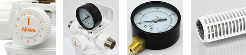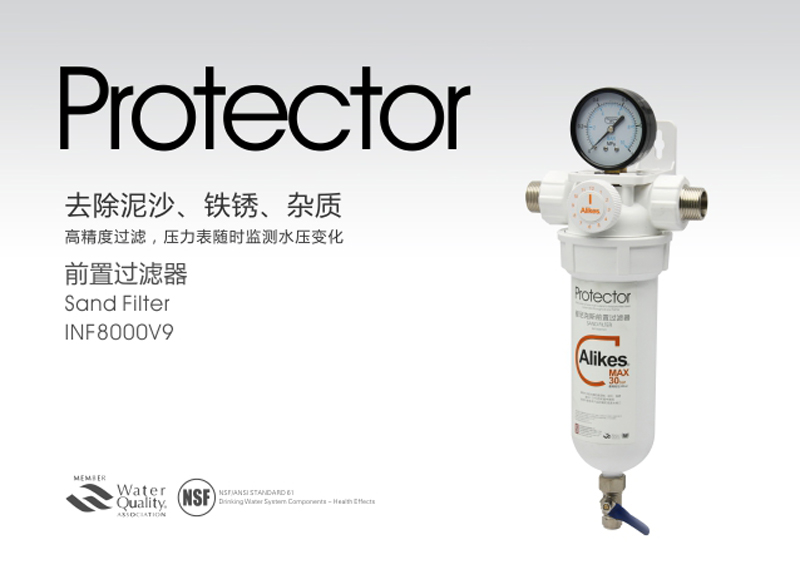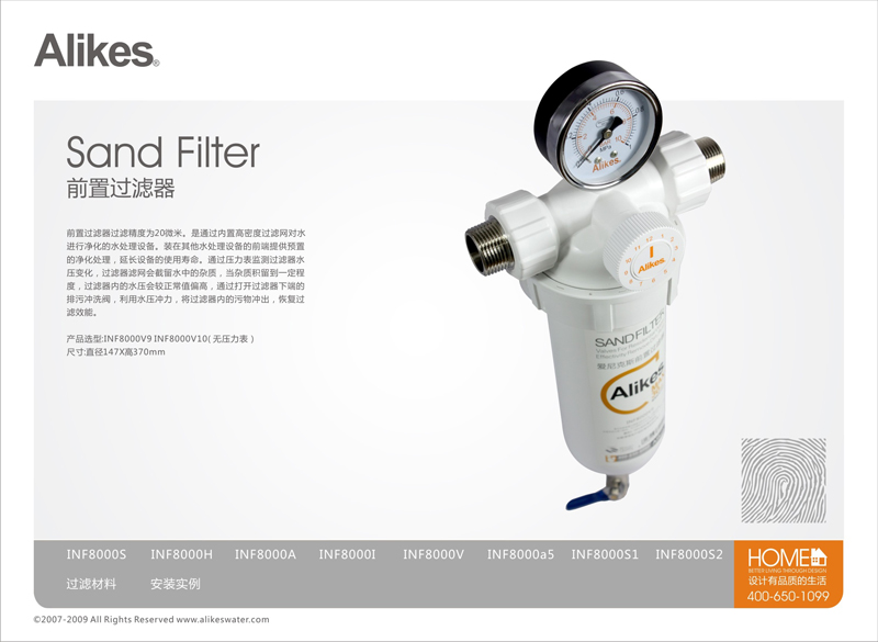 Alikes前置过滤器是通过内置高密度过滤网对水进行净化的水处理设备。过滤精度为20微米。装在其他水处理设备的前端提供预置的净化处理,延长设备的使用寿命。通过压力表监测过滤器内水压变化,过滤器滤网会截留水中的杂质,当杂质积留到一定程度,过滤器内的水压会较正常值偏高,通过打开过滤器下端的排污冲洗阀,利用水压冲力,将过滤器内的污物冲出,恢复过滤效能。