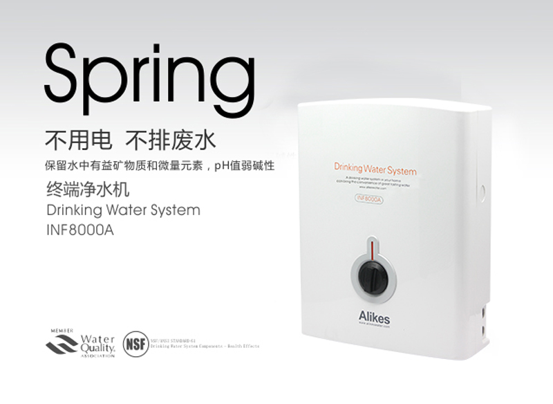 Alikes净水机是对市政自来水或可以饮用的地下水进行二次深度净化处理的终端水处理设备,出水品质符合卫生部《生活饮用水水质卫生规范》(2001)的规定。净水机利用市政管道自来水的压力驱动水流,通过独特的滤芯来达到生饮的标准。陶瓷芯可去除水中的泥沙、******、铁锈、悬浮物,终身刷洗120次;KDF可去除有害重金属;烧结活性炭吸附水中余氯、异色和异味。不需用电,不产生废水,即用即饮,不需储水罐避免二次污染。内置流量计根据用水量自动断水确保饮水健康。是净水机中的高端产品。