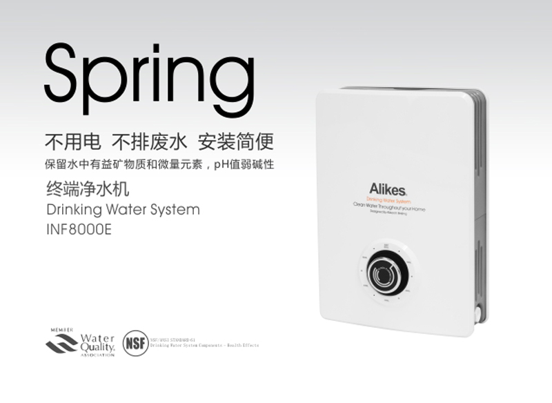 Alikes INF8000E净水机,采用国际流行的双芯过滤的101水道平台,食品级高强材料成型,完善的人机工程学设计。采用大显示的刻度盘以及阻尼适度的流量旋钮。使用Alikes通水切换开关,同样的******设计与净水机配合相得益彰。去除水中的泥沙铁锈,微生物、******,有害重金属,游离余氯。同时改善了水的口味。饮用起来更清冽甘甜。