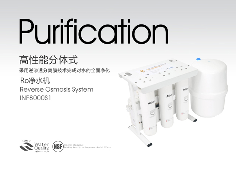 Alikes RO净水机是对市政自来水或可以饮用的地下水进行二次深度净化处理的终端水处理设备,出水品质符合卫生部《生活饮用水水质卫生规范》(2001)的规定。净水机应用了******进的逆渗透分离膜的技术,依靠增压泵对原水施加压力,使原水透过逆渗透膜,把原水中细微杂质、过多的无机盐、有机物、重金属离子、******、病毒、农药、三氯甲烷致癌物等有害物质截留,并通过连续排放的浓水出口(污水排放口)将这些水中有害异物排出。进而完成对水质的******净化。
